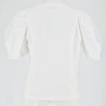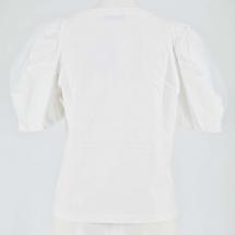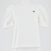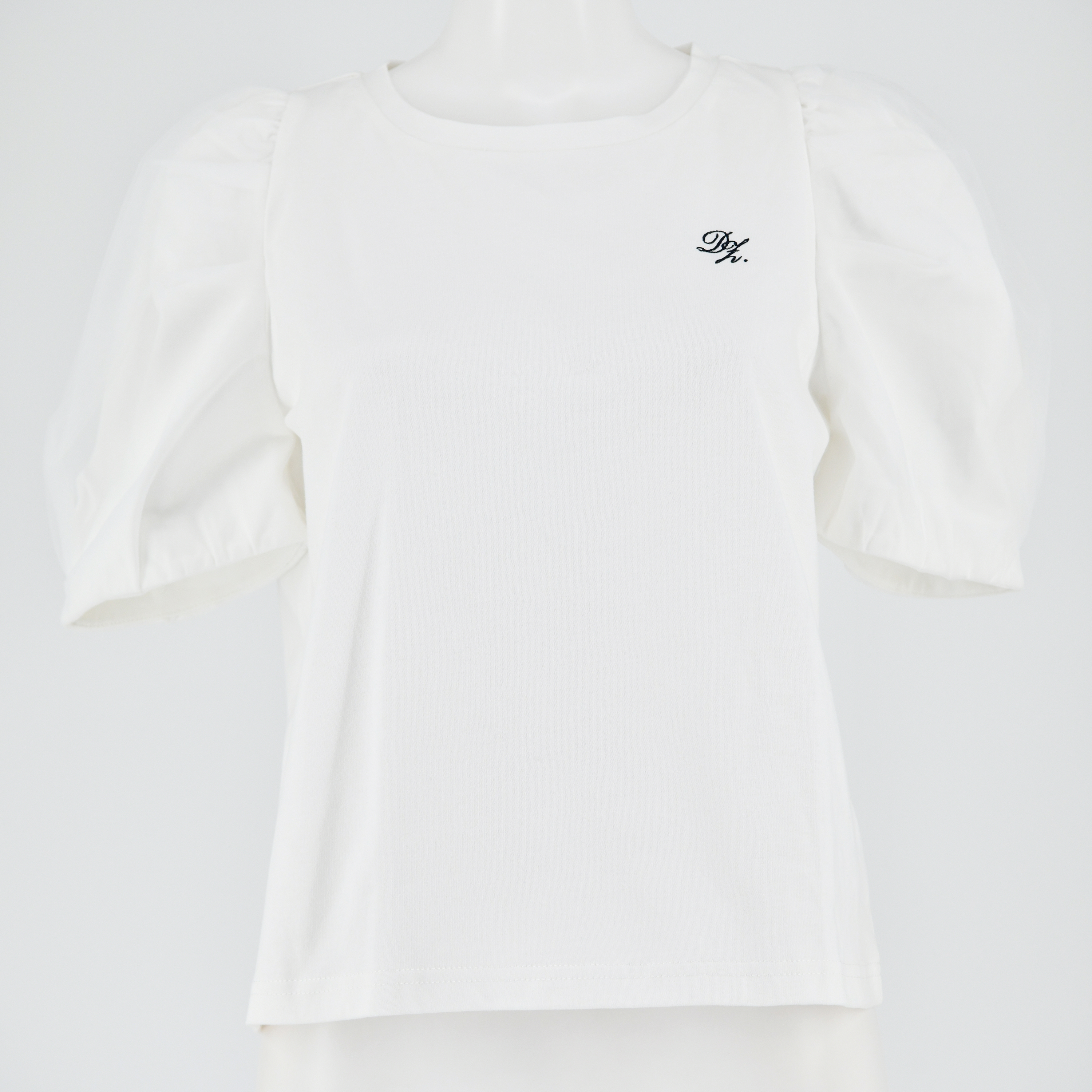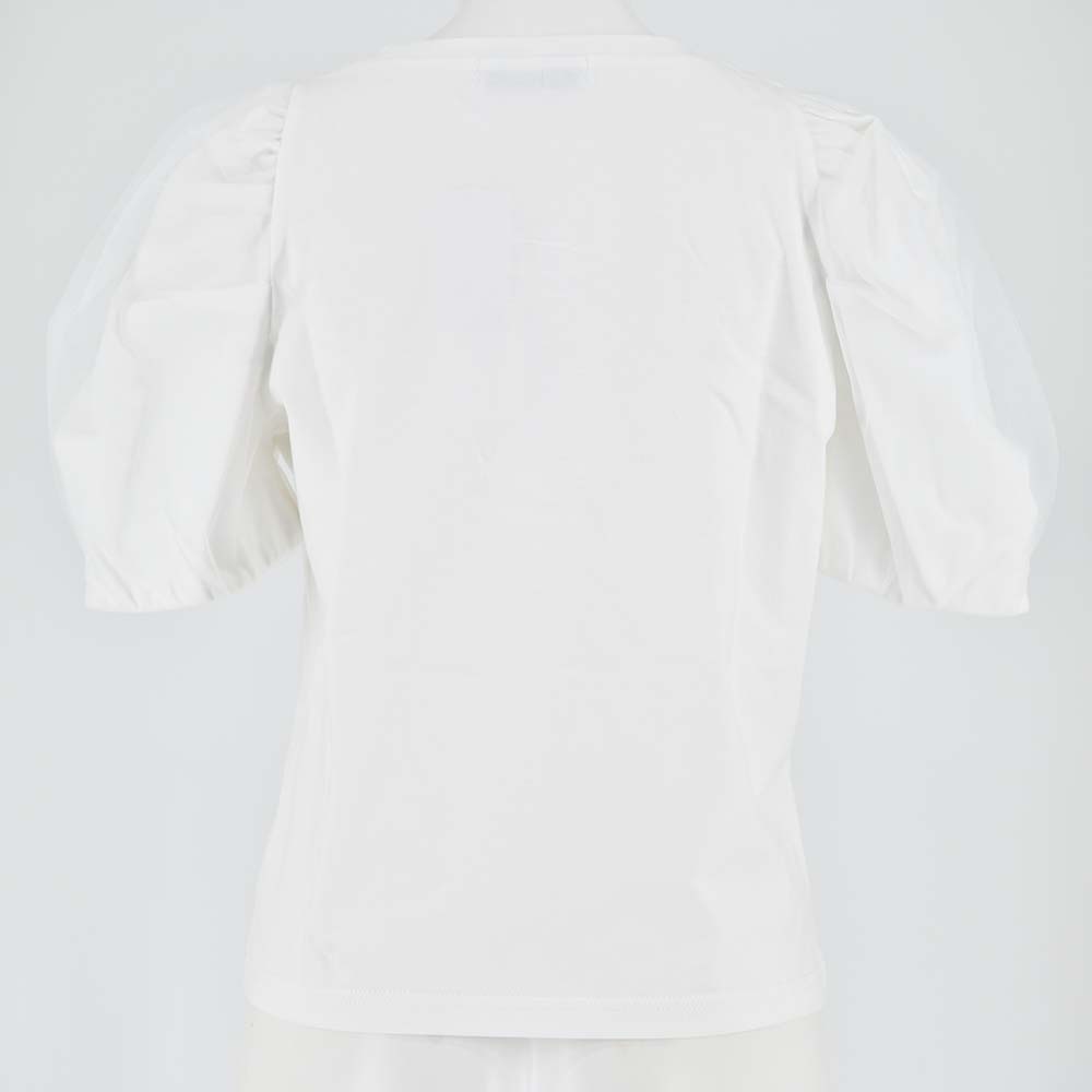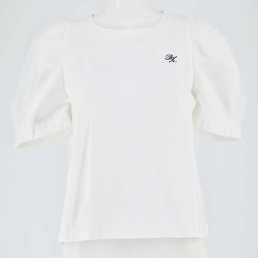 袖元はチュール素材で軽やかな腕元を実現。 ギャザーを入れて立体的な表情を描きます。 左胸の甘めな刺繍は清潔感を出して控えめなデザインながらも華やかに。