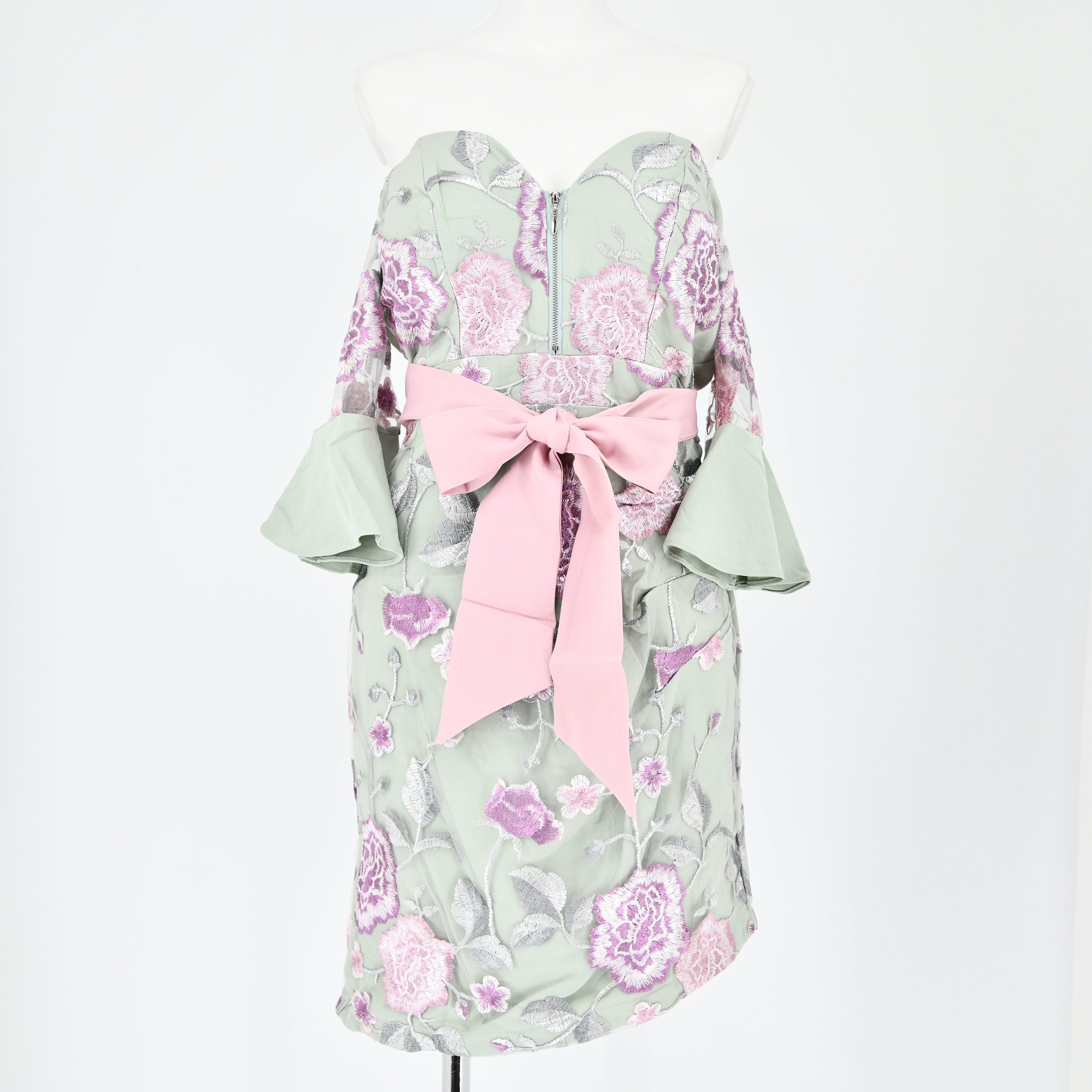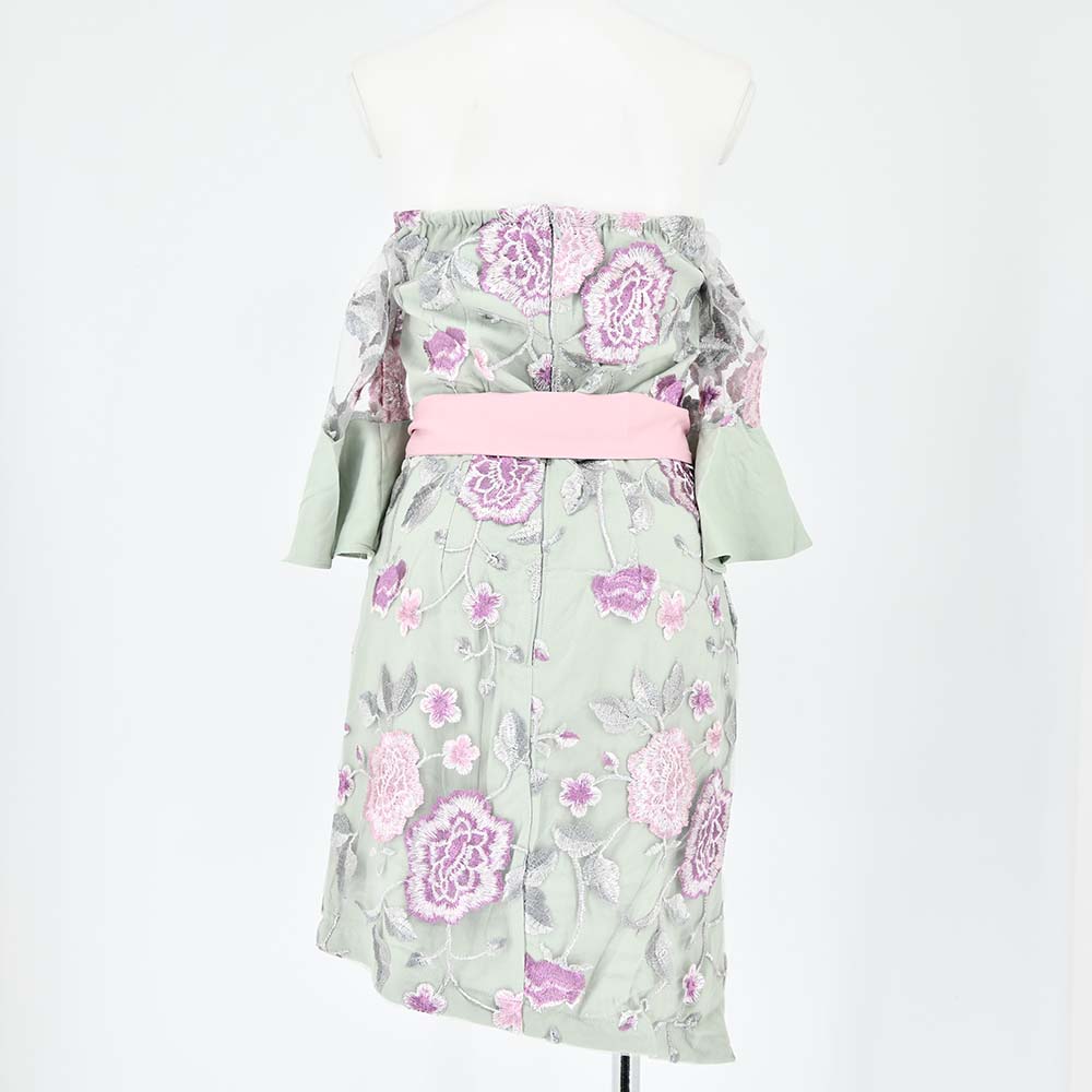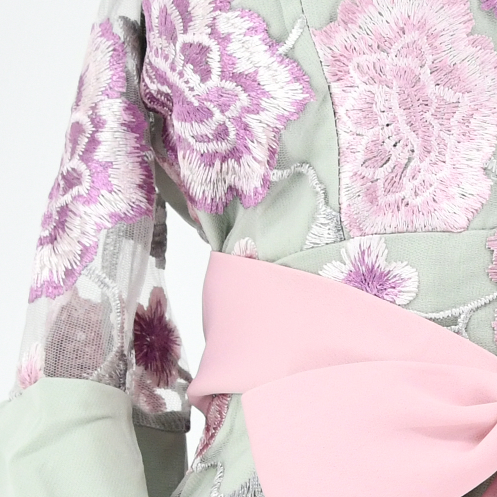 旬顔になれるフロントジップの甘さ控えめな大人可愛いタイトミニ。 乙女の儚さを漂わせつつ、色っぽいシアー×フラワー刺繍が全身を彩る欲張りなドレス。 リボンベルトをラッピングすればお洒落なアクセントカラーをONできます♪