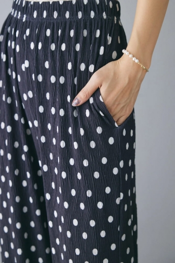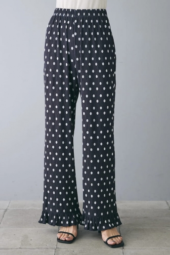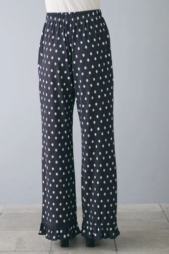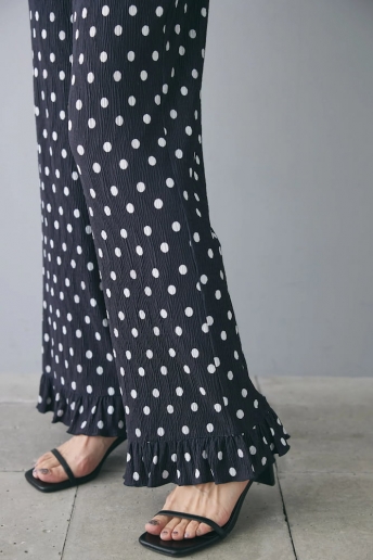 スカラップスリーブが映えるティアードブラウスに合わせたのは、爽やかさをもたらすドットプリントパンツ。ボトムの生地の涼感も相まって、目を引くサマースタイルが完成します。美脚を狙えるシルエットだから大人らしくいられて、裾のフリルで足元まで抜かりなく。