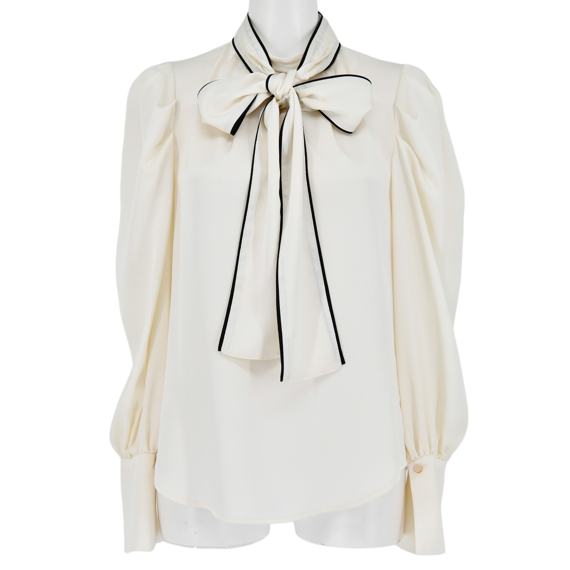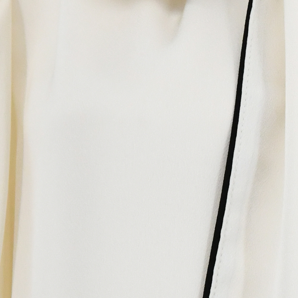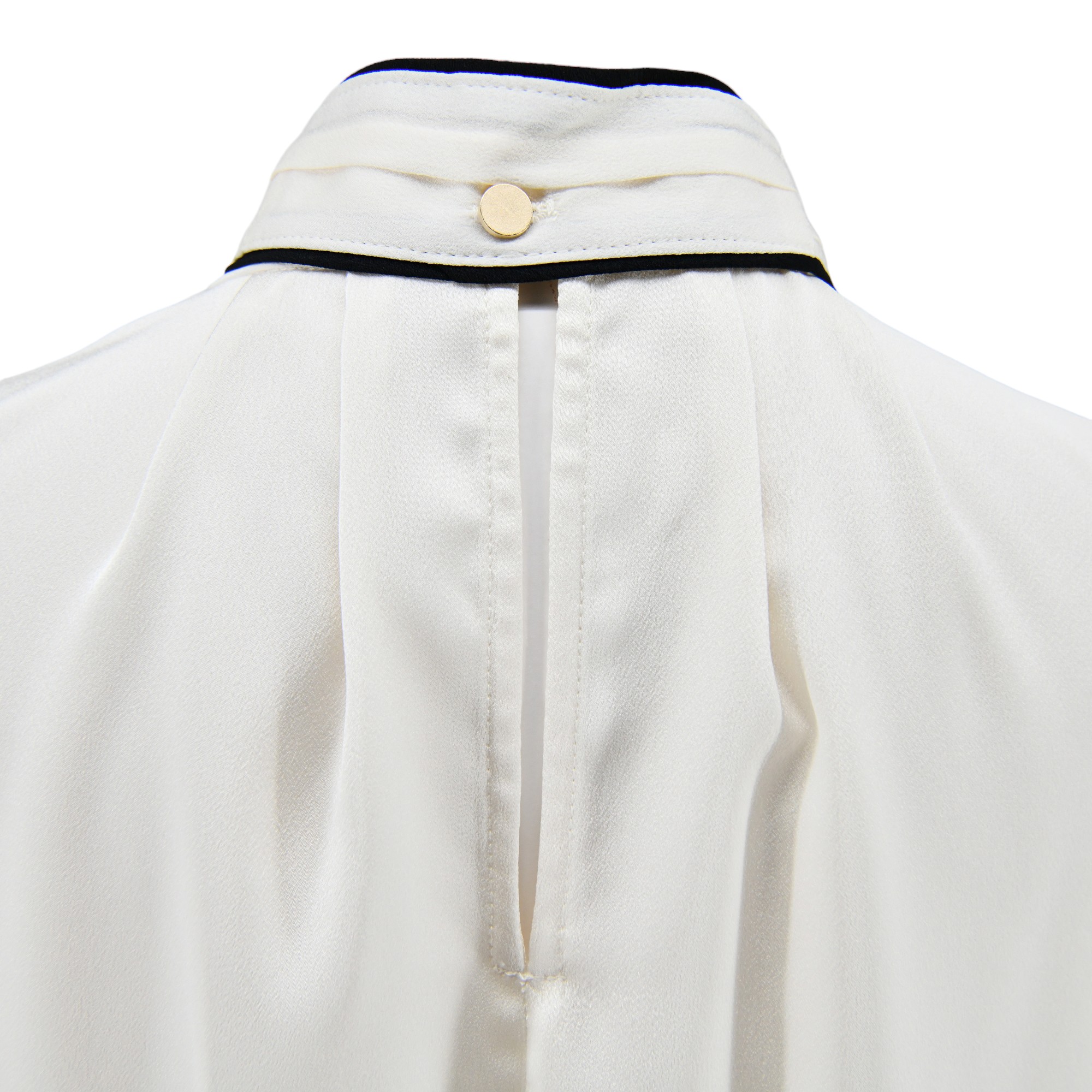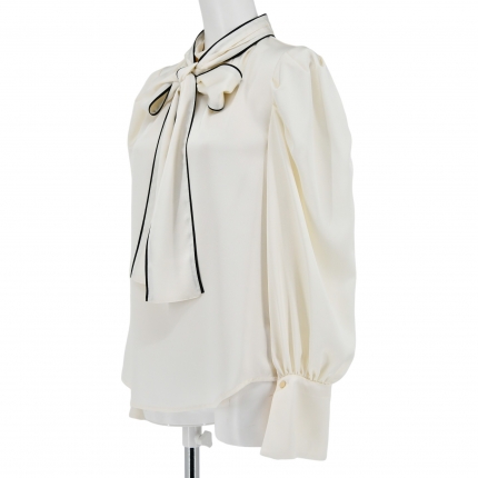ボウタイリボンを縁取る印象的なバイカラーラインにこだわり、とことんクラシカルに仕上げたブラウス。ボウタイを外せばトレンドライクなチョーカーディティールに早変わりし、さり気ないヘルシーな肌見せが女性らしさを演出します。きちんと感がありつつもさらっと抜け感のあるデザインが、デイリーからオフィスまで幅広いスタイリングに活躍する1枚です。