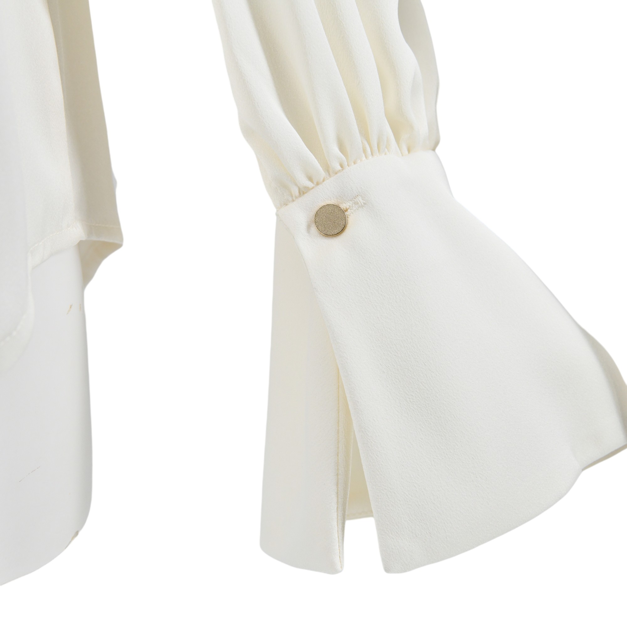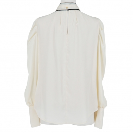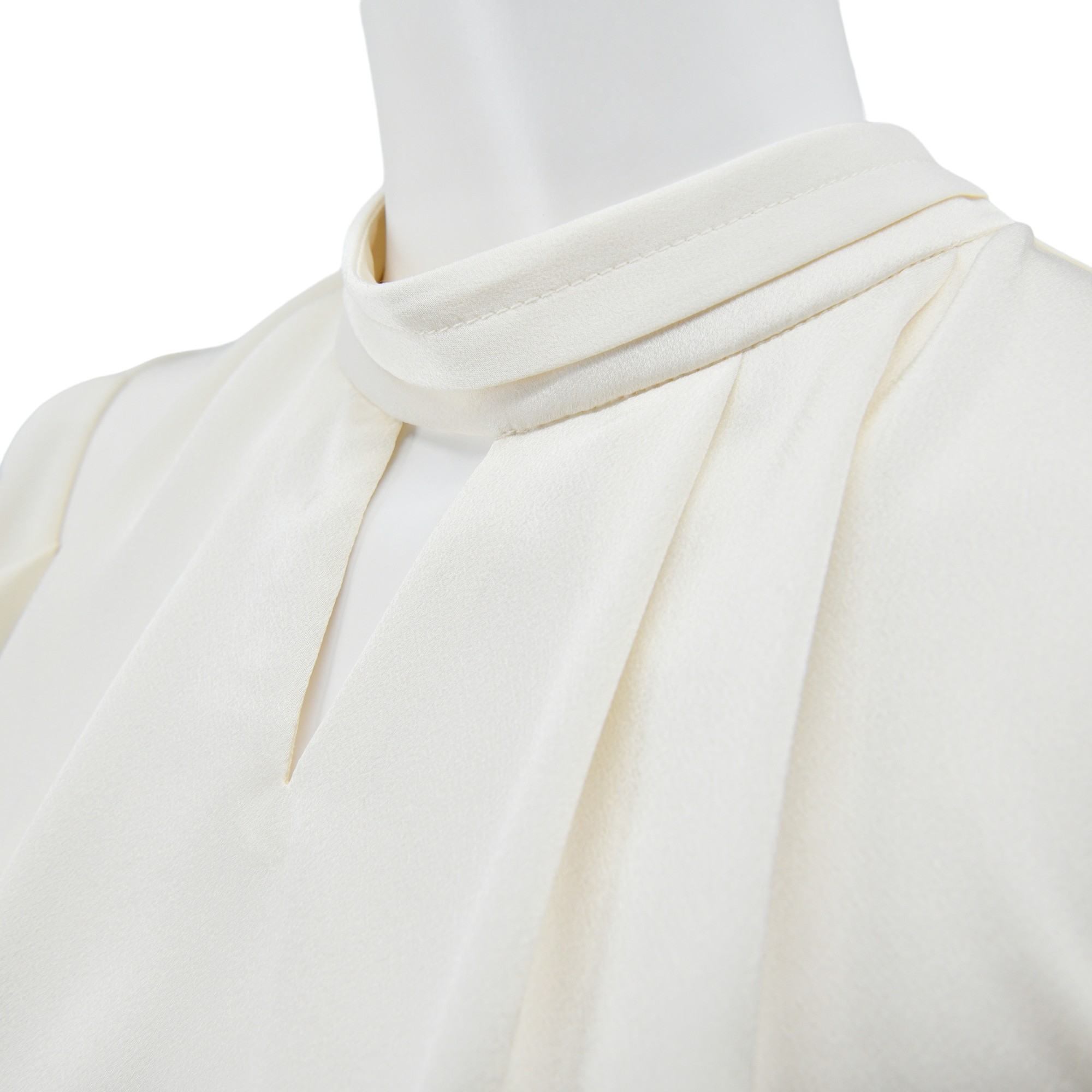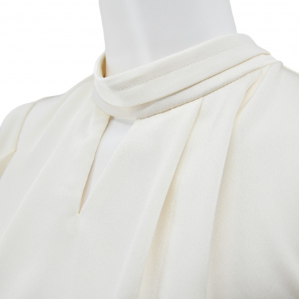 ボウタイリボンを縁取る印象的なバイカラーラインにこだわり、とことんクラシカルに仕上げたブラウス。ボウタイを外せばトレンドライクなチョーカーディティールに早変わりし、さり気ないヘルシーな肌見せが女性らしさを演出します。きちんと感がありつつもさらっと抜け感のあるデザインが、デイリーからオフィスまで幅広いスタイリングに活躍する1枚です。
