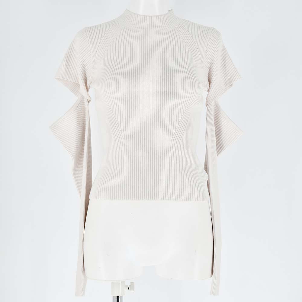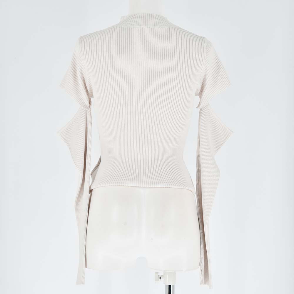 スリット見えのようなアームウォーマーデザインが旬なニットトップス。