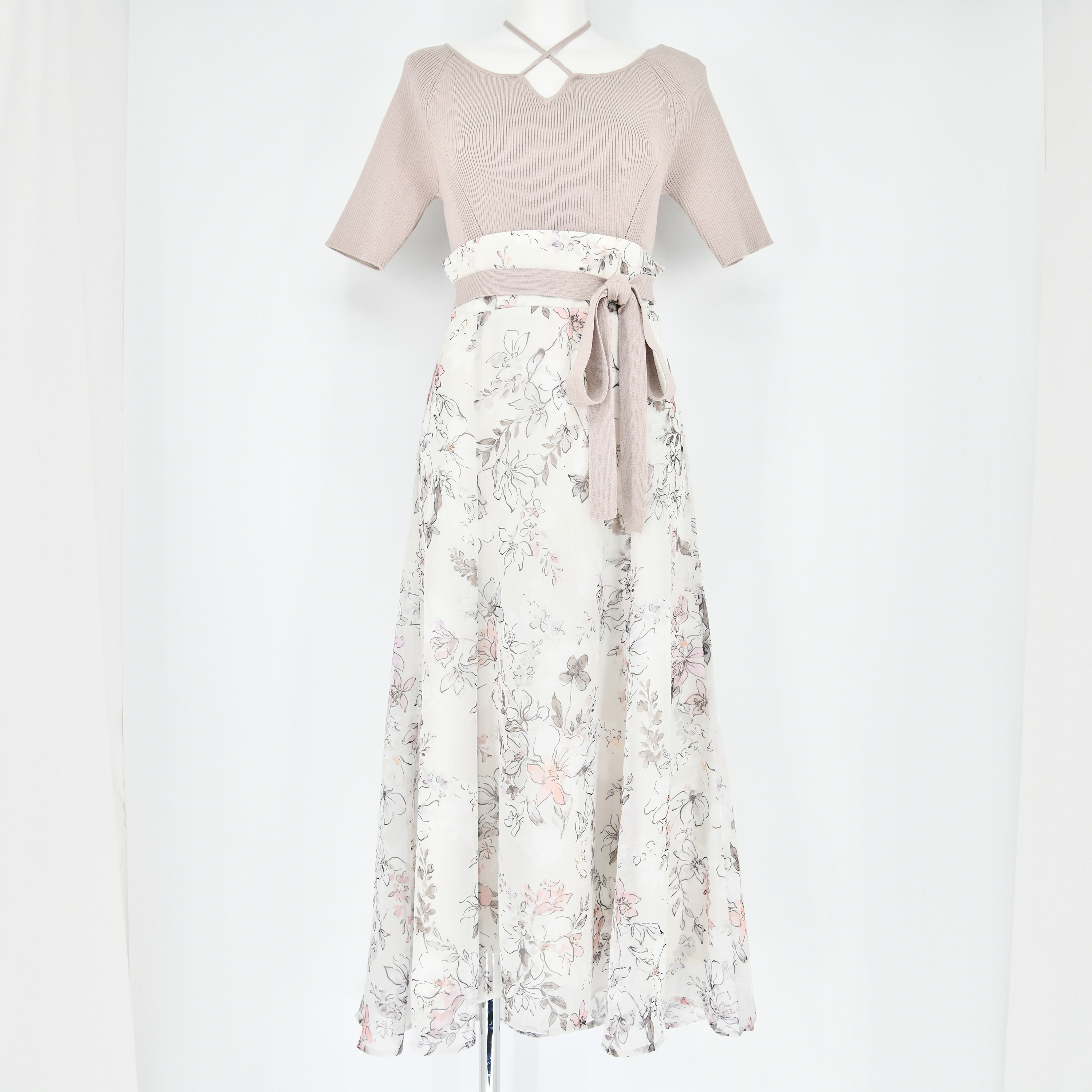 ニットでできたウエストリボンを結ぶとよりウエストがマークされてポイントに。