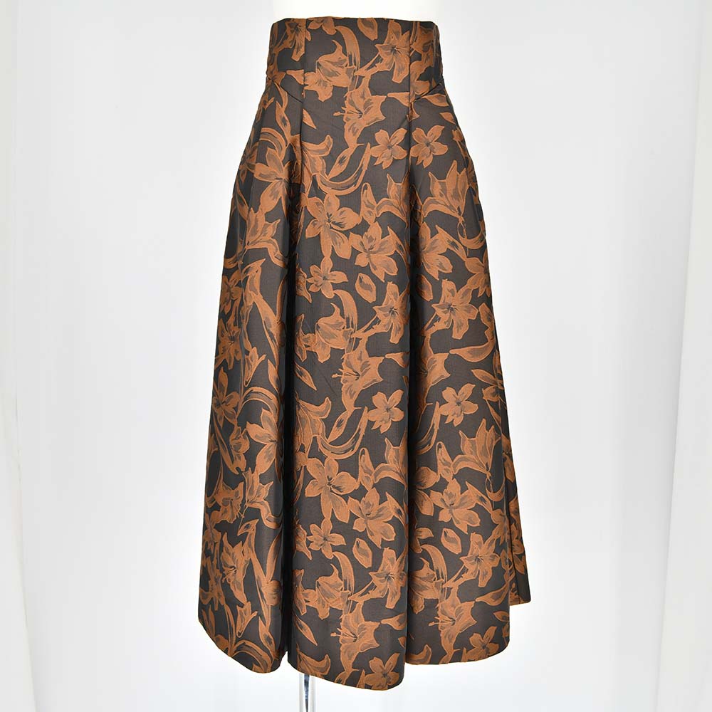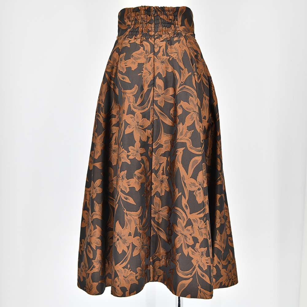 ボタニカルなオリジナルジャカード柄が上品で大人っぽいタックフレアスカートです。
