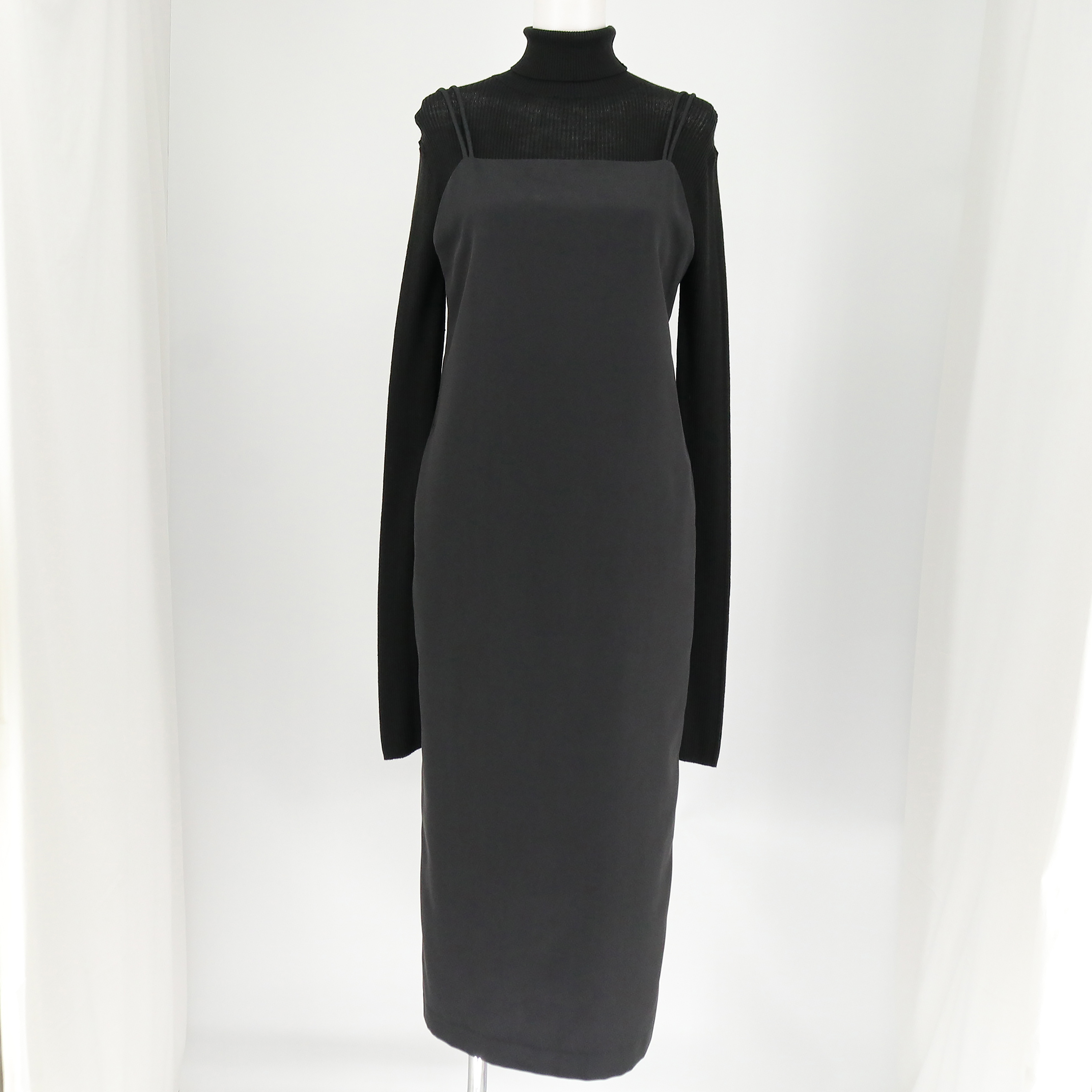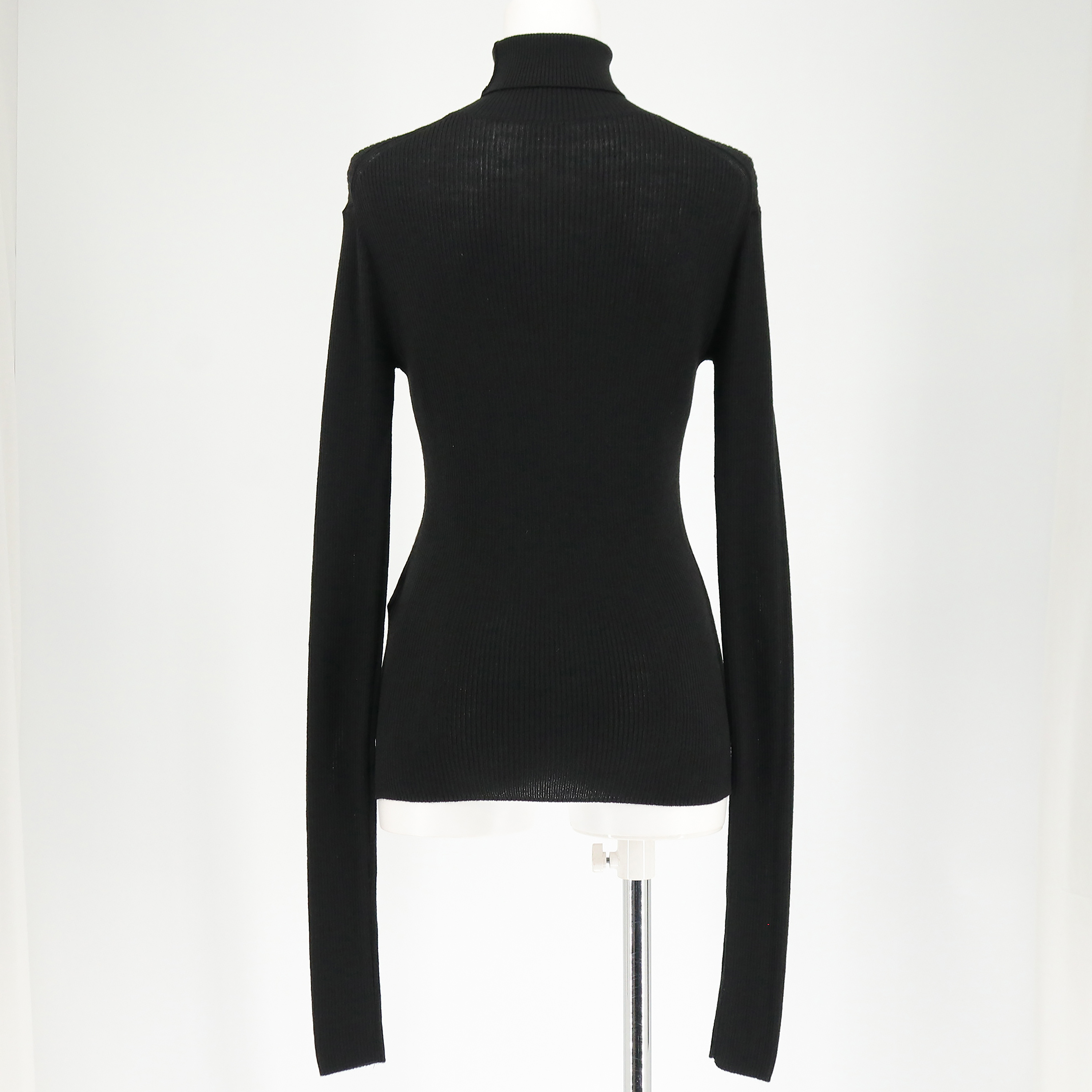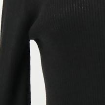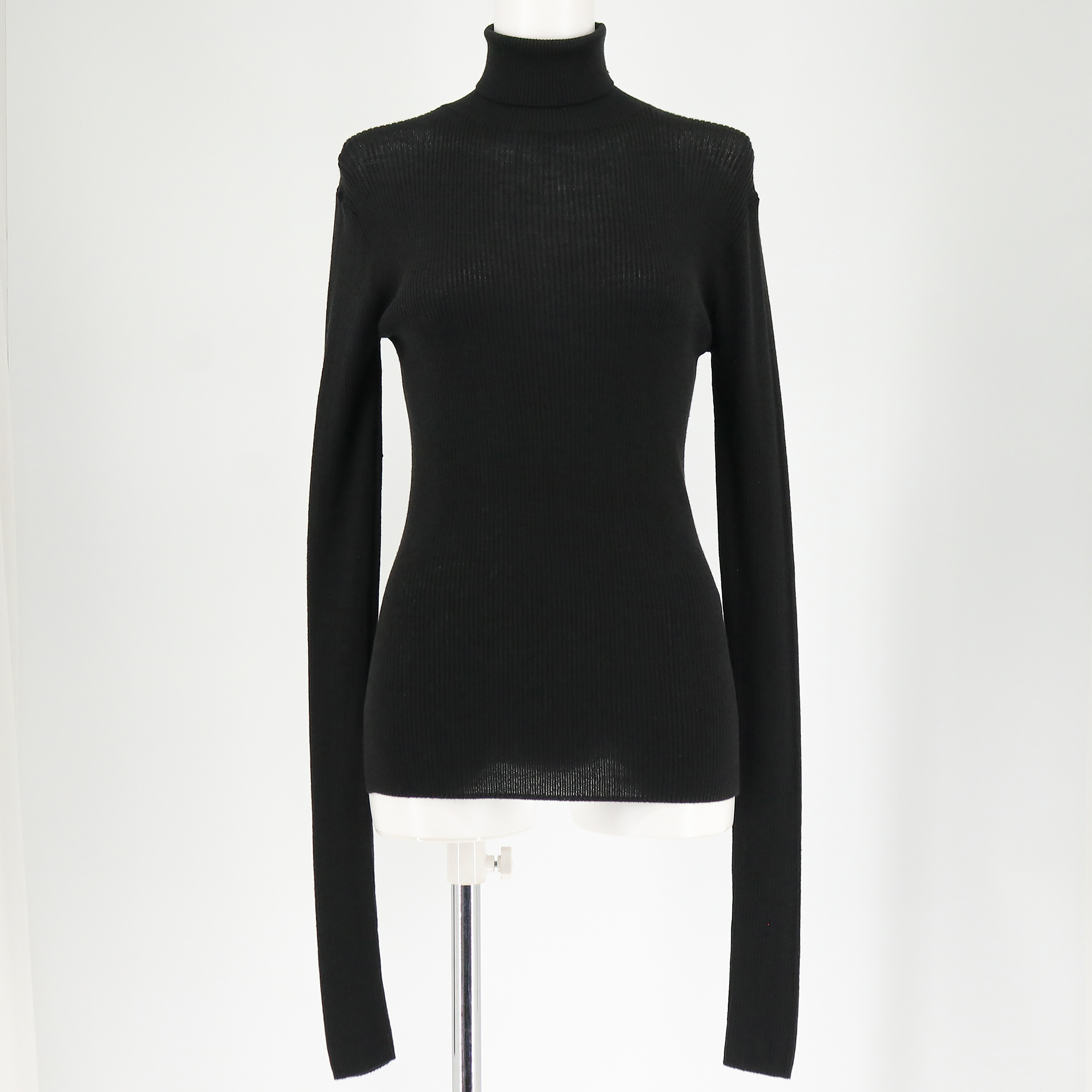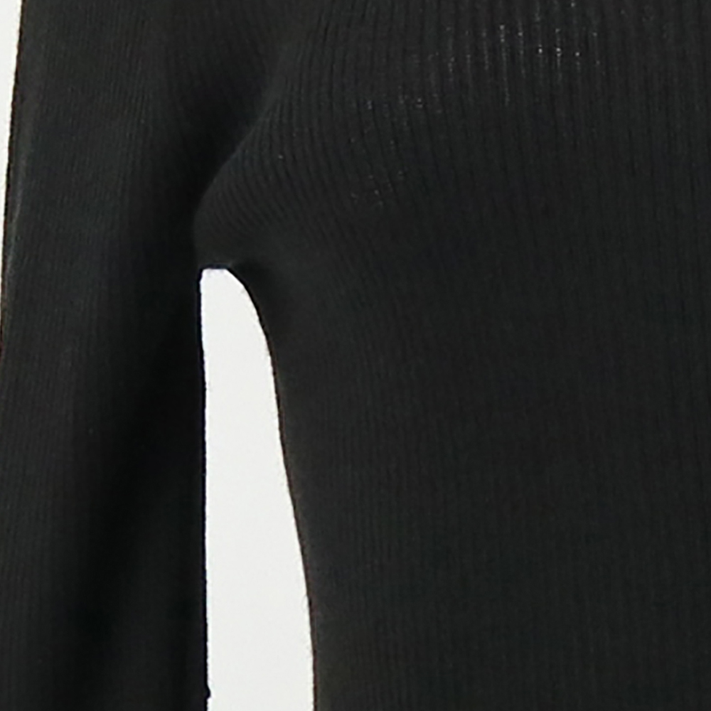 細いリブ編みが縦ラインを強調し、やや透ける肌が大人の色香を纏います。手首にくしゅくしゅと生地がたまるよう袖は長くし、シンプルな中に女性らしさとエッジを加算しました。