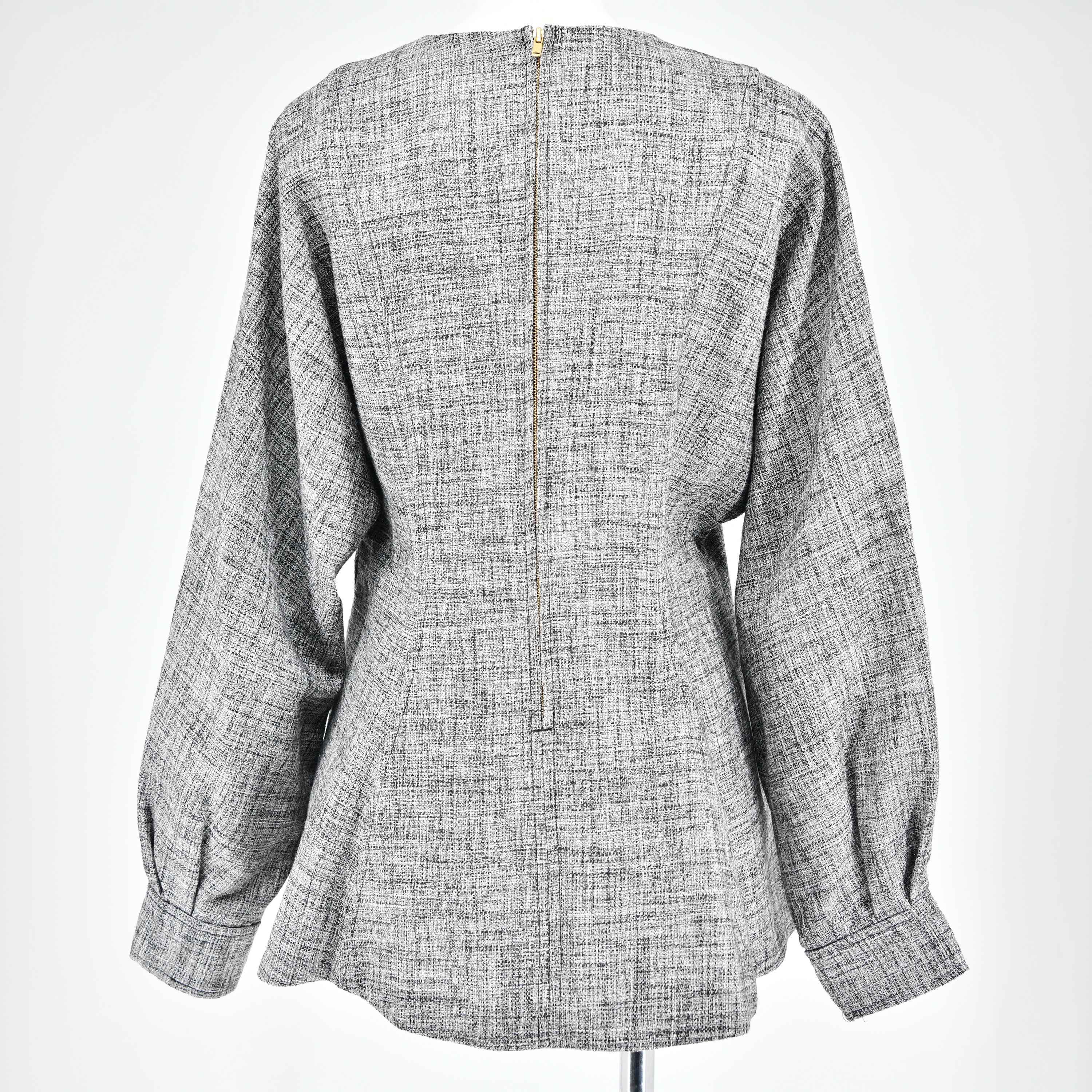 フェミニンなペプラムシルエットが目を惹くトップスは、巧にあしらった切り替えとモードなボリュームスリーブがポイント。カーヴィなメリハリが女性らしさを強調し、エレガントなムードとスタイルアップの両方を叶えます。