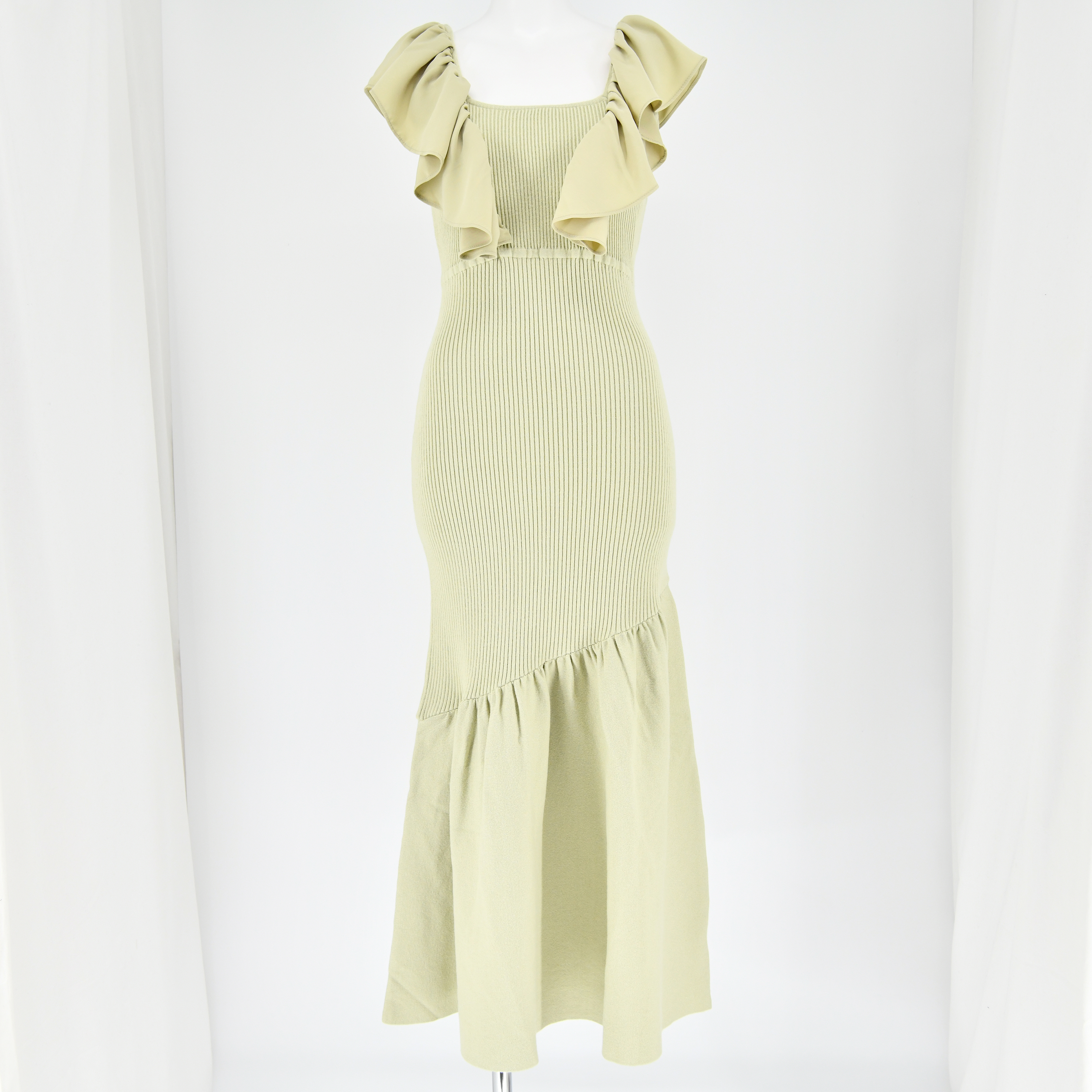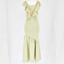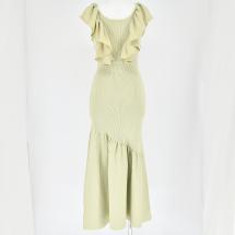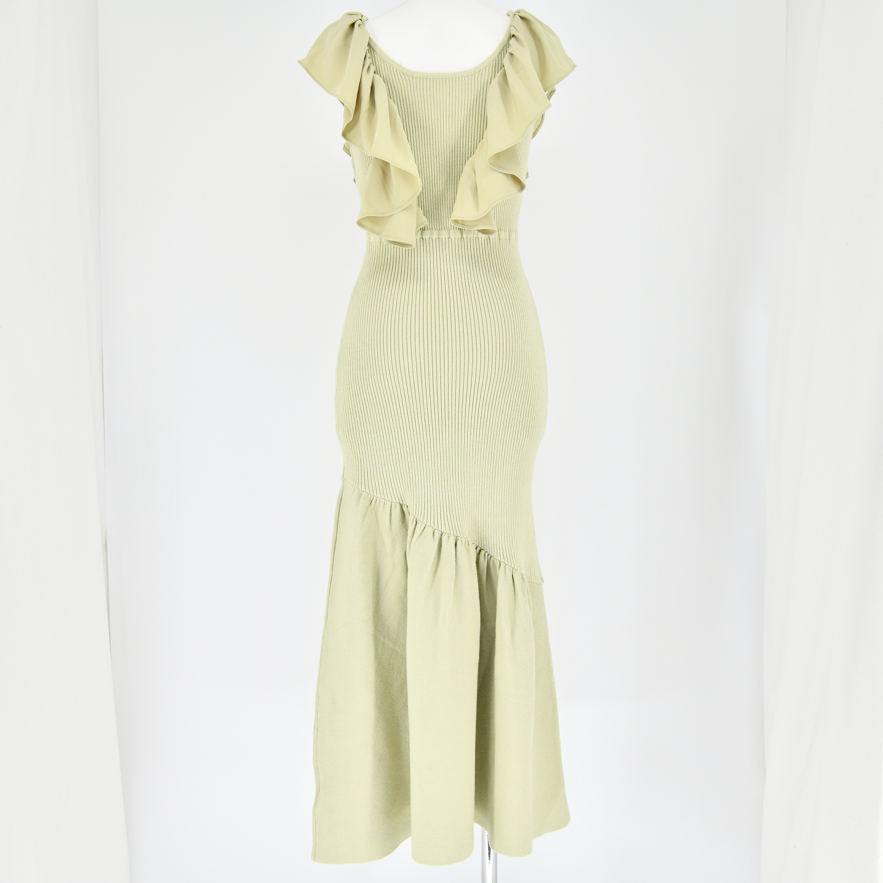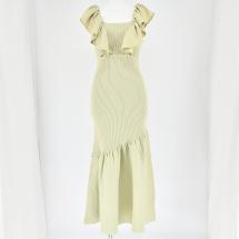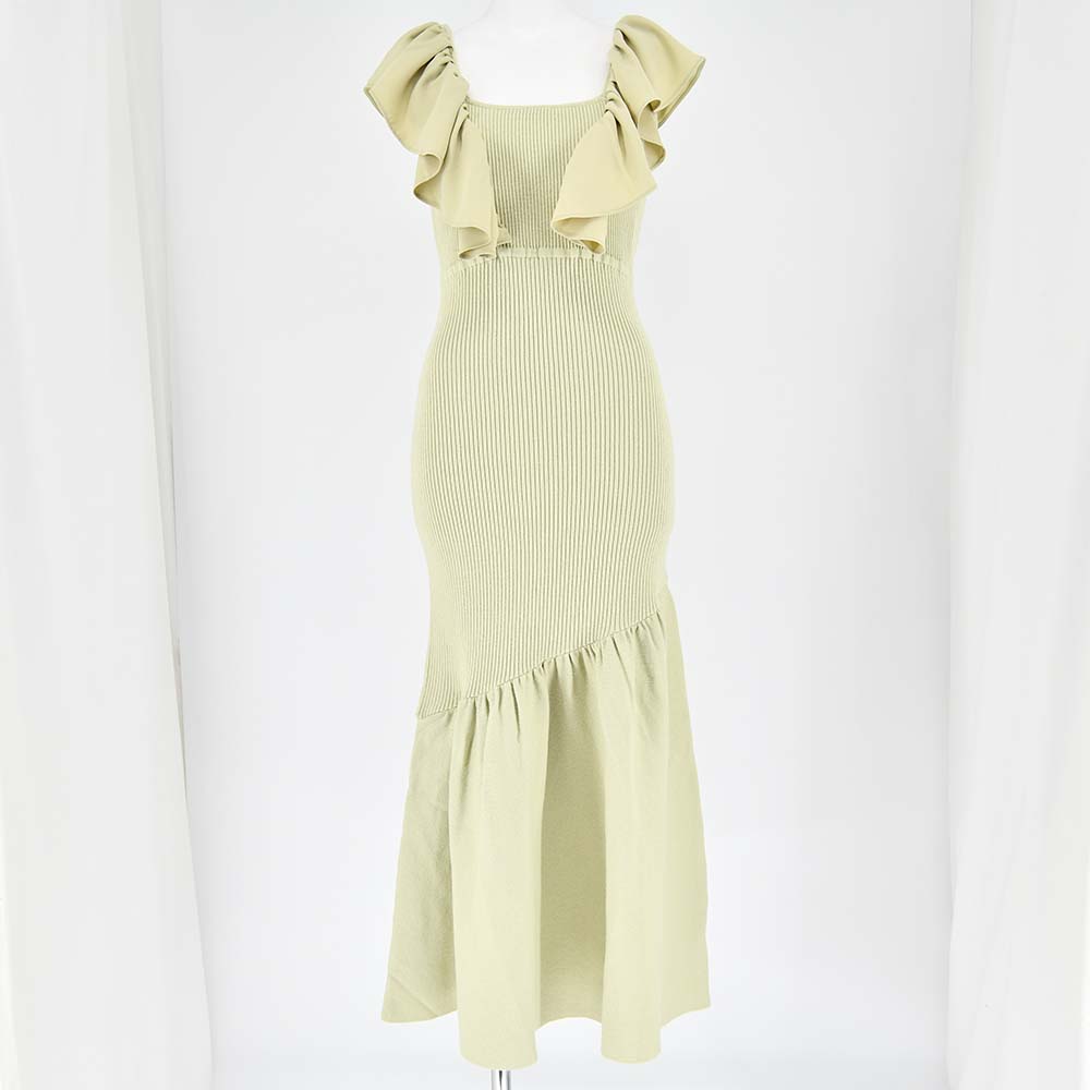 ラッフル部分だけ布帛にすることで動きが出るように仕上がっています。コーデのポイントになり肩回りを華奢に見せてくれます。ワンピース自体はニット生地なので伸縮性があり着やすく、ボディに程よくフィットしメリハリのあるシルエットを演出。マーメイドシルエットのフレア部分は編地をボディよりも薄くすることでギャザーを寄せやすくし、フレアシルエットが出やすいように拘ったワンピースです♪