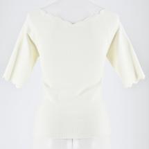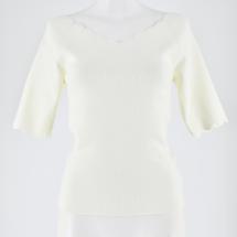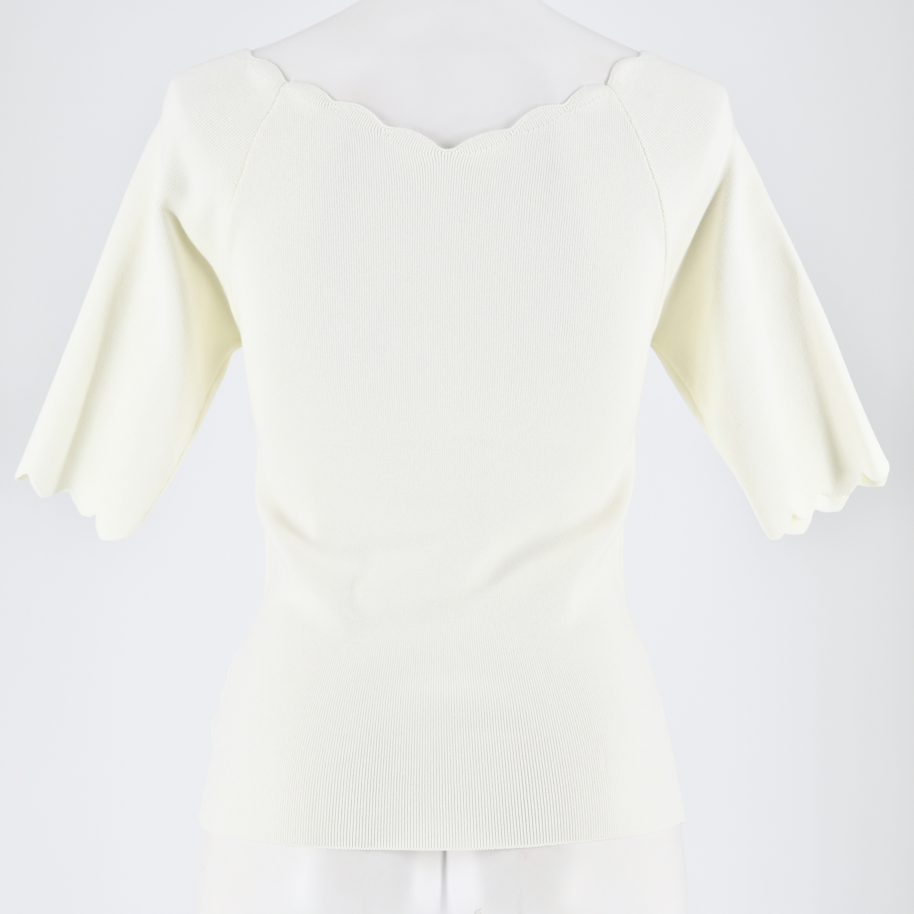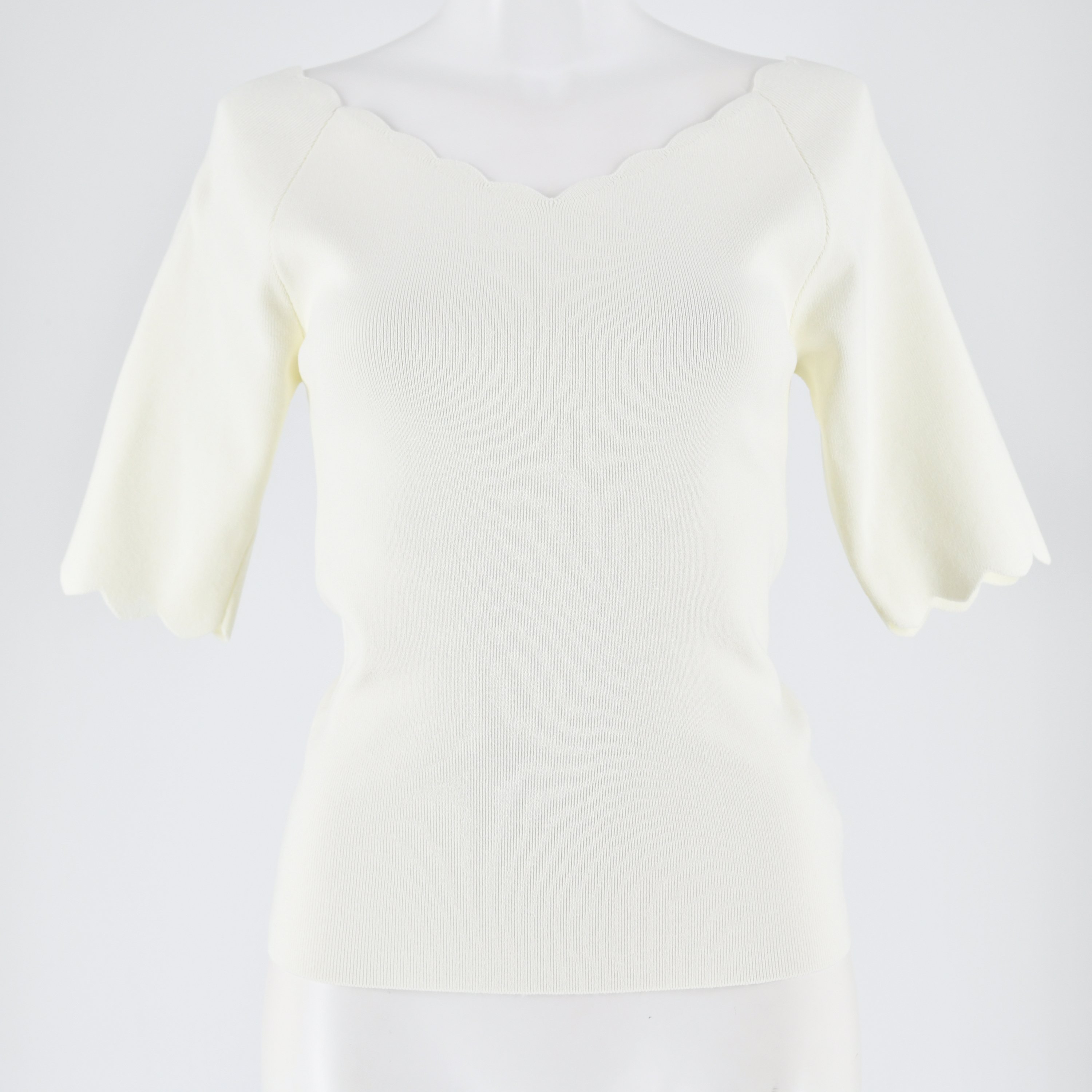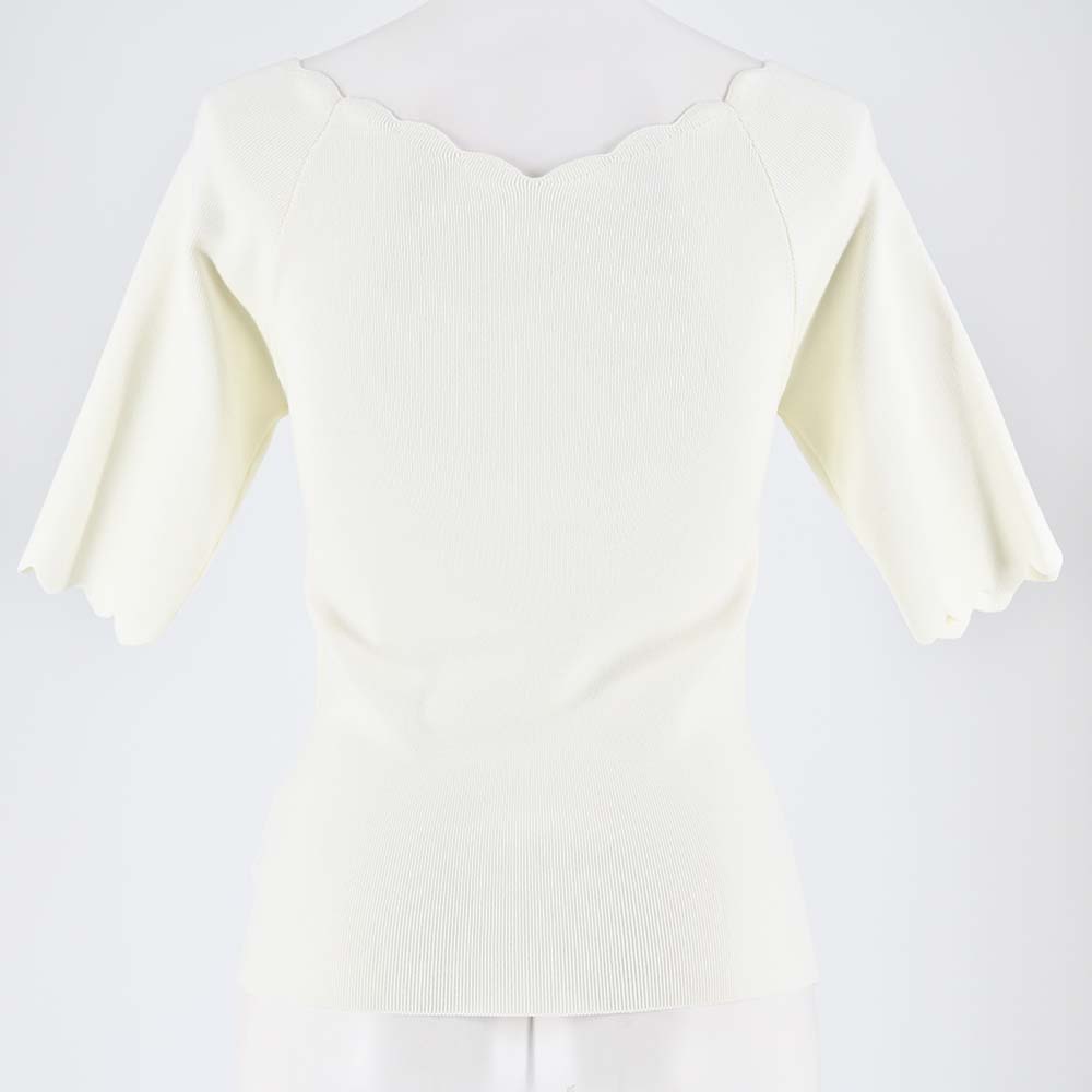 スカラップカットした襟ぐり&袖口が特徴的な、シンプルながらも女性らしさを感じさせるニットトップス。広めに開いたネックラインでヘルシーに肌見せでき、トレンド感をプラスしました。ボディラインを美しく見せるタイトシルエットも◎。スカートからパンツまで幅広いボトムと合わせやすく、着まわし力も抜群です。