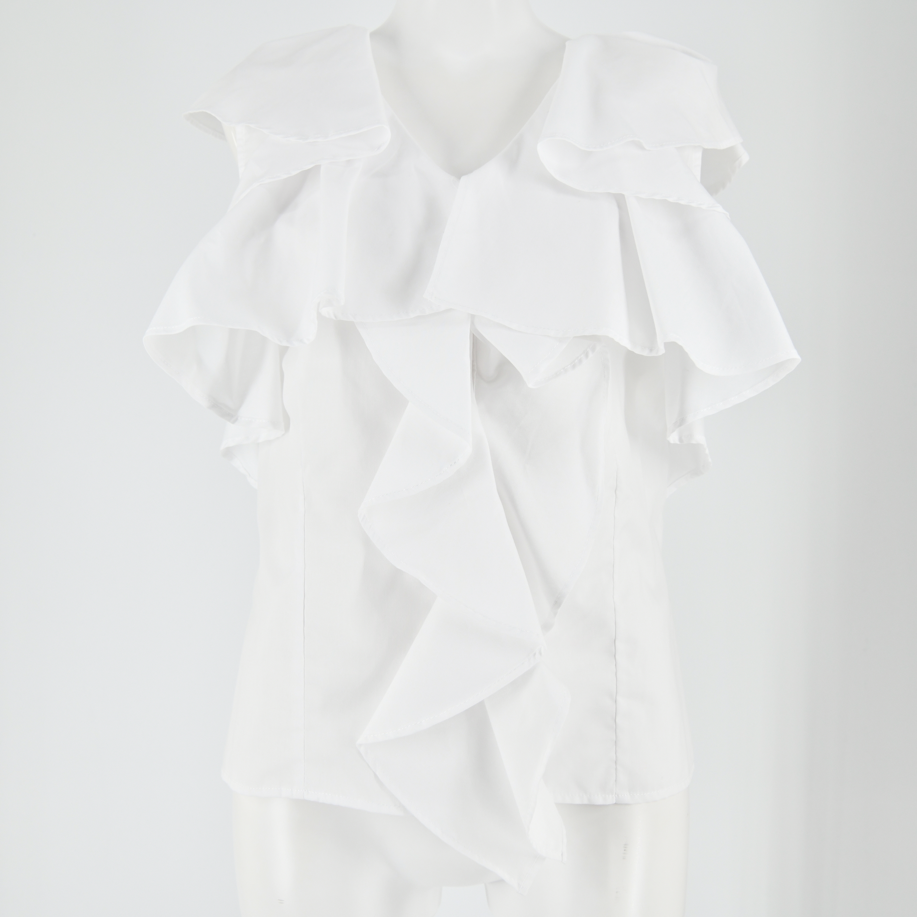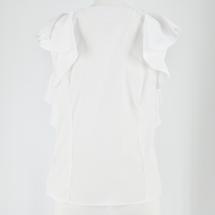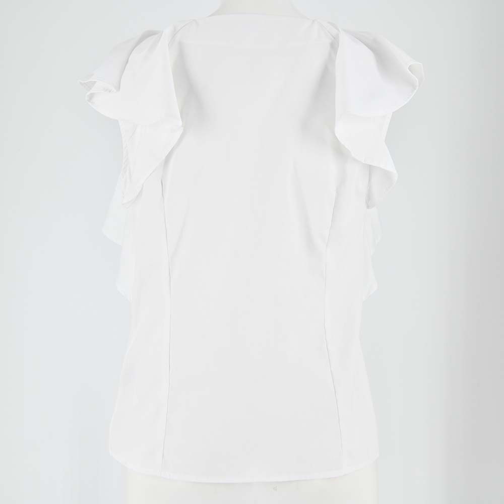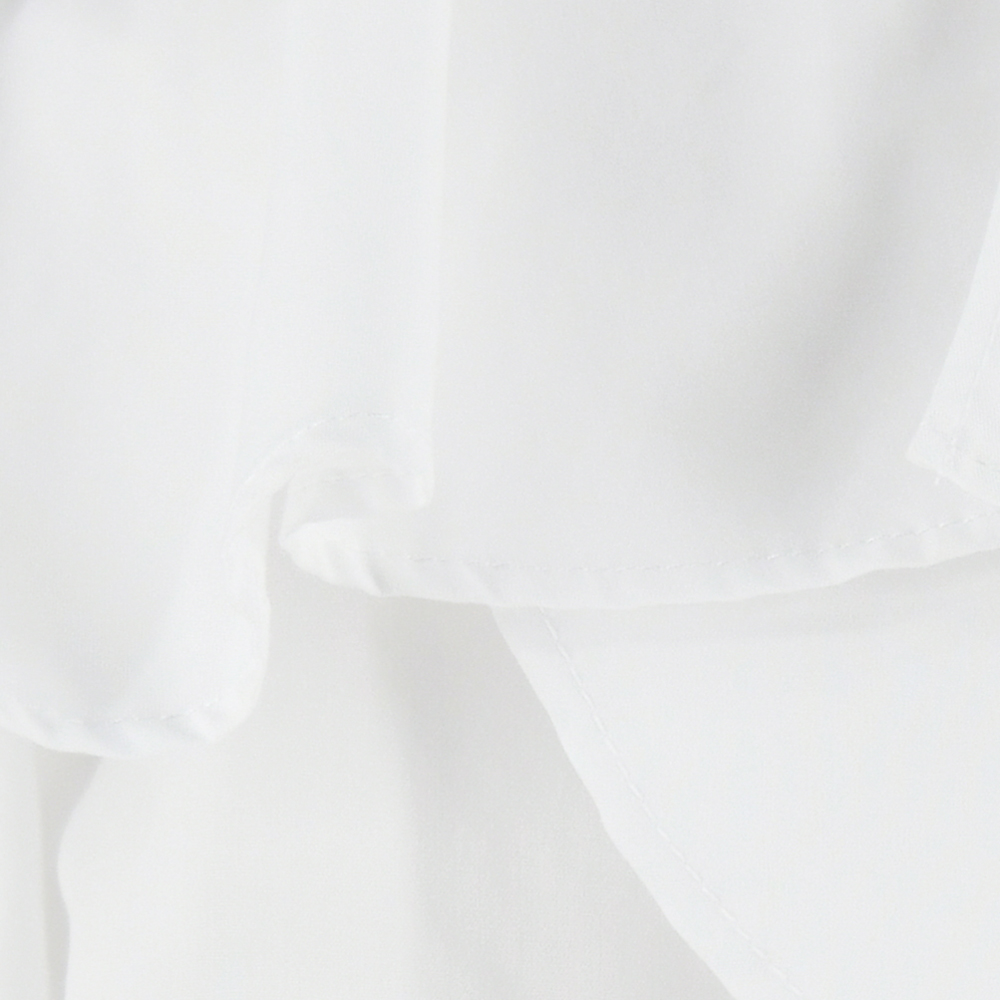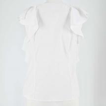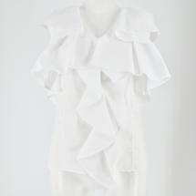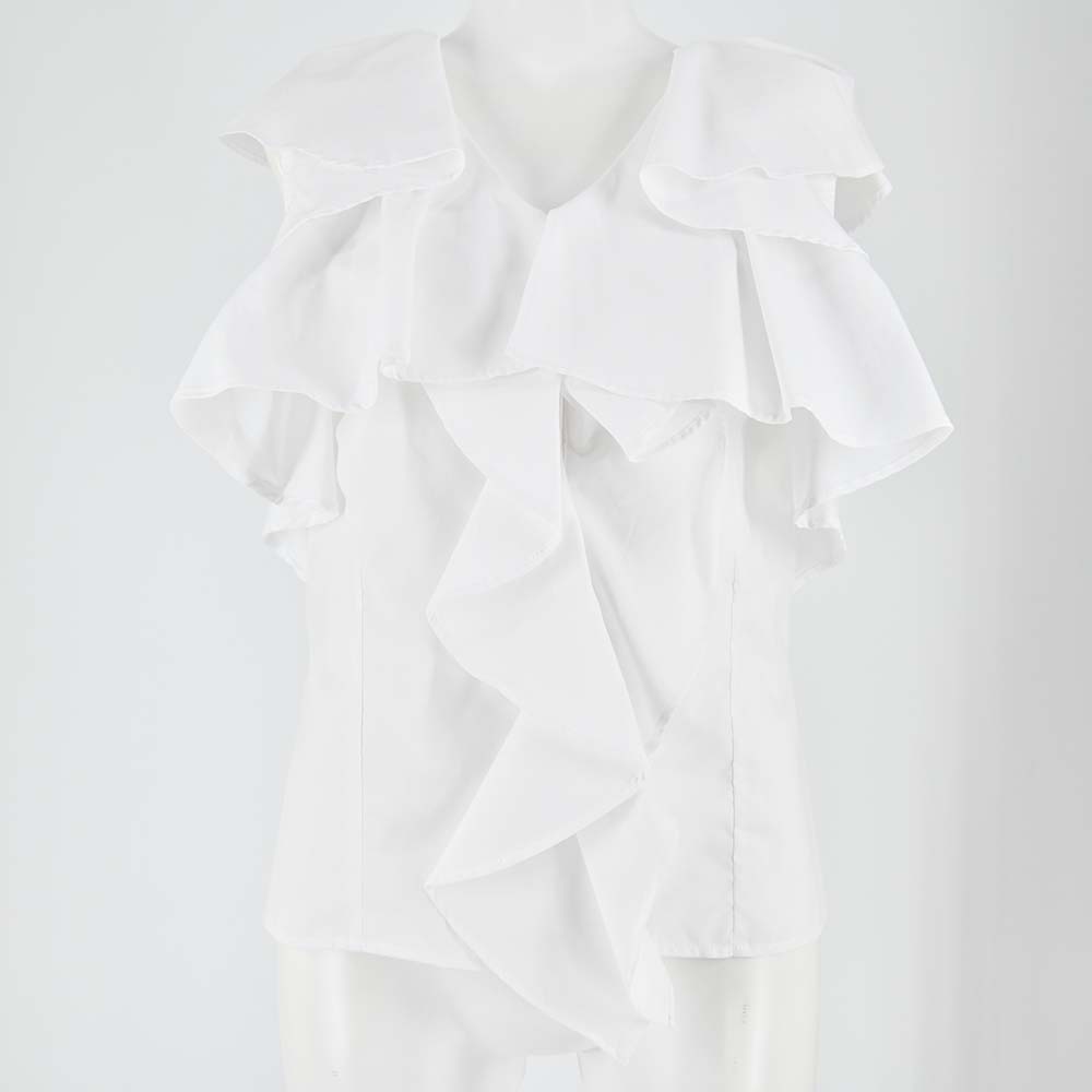 袖からフロントに繋がるボリューミーなフリルが印象的な、エレガンスムード溢れるノースリブラウス。華やかさ溢れるルックスでスタイリングをクラスアップしてくれる優秀な1着です。身頃部分は前後にタックを入れすっきりと仕上げることでボリュームのあるディテールと好バランスに。ボトムスにインしてもアウトでも合わせやすく、幅広いアイテムと好相性です。