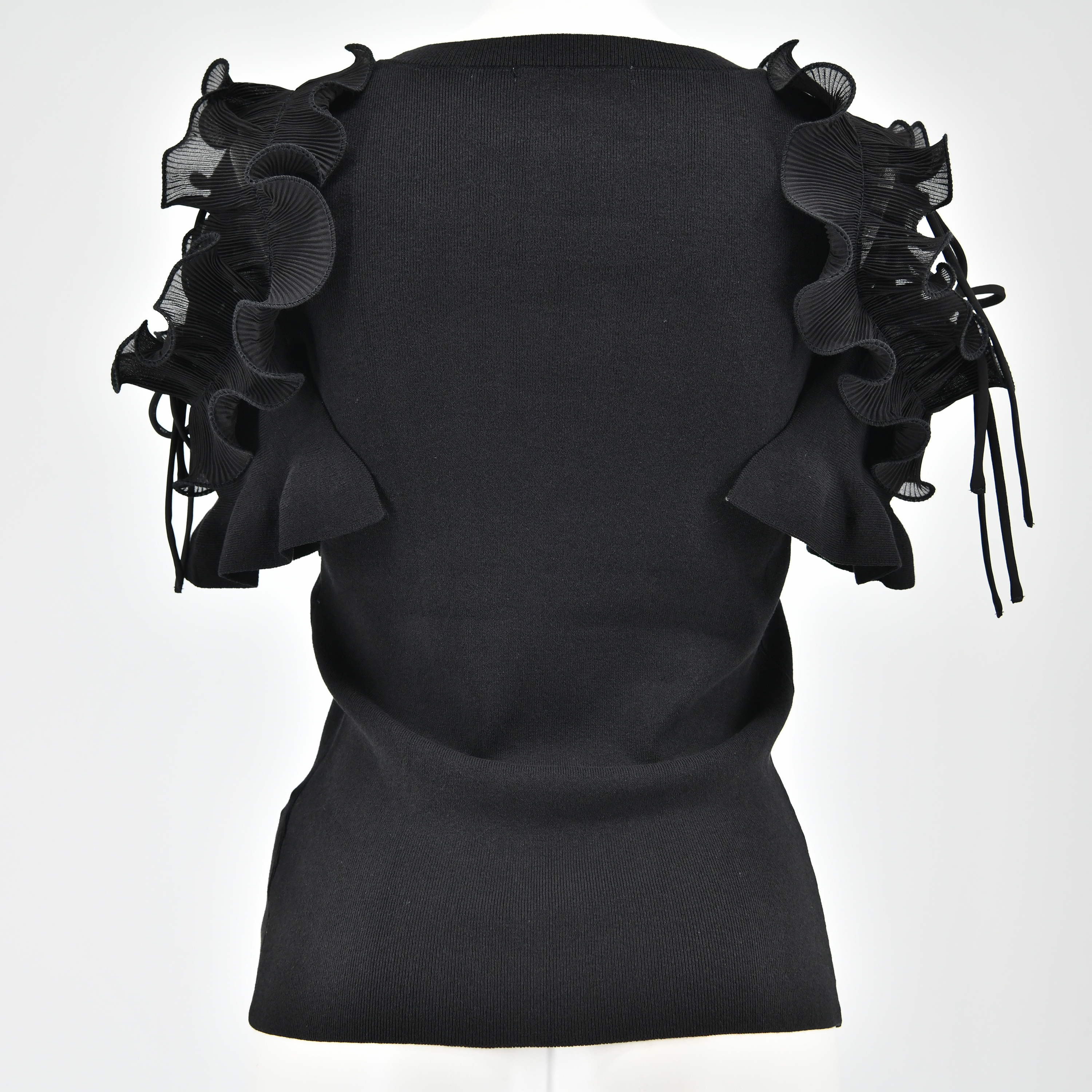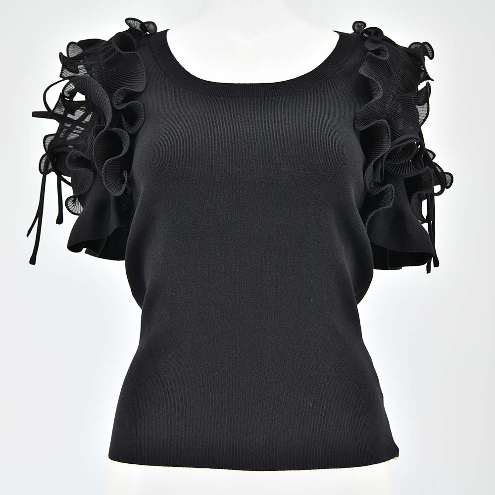 「SNIDEL」定番のシアーフリルニットが今季も登場。袖のフリルはシフォンプリーツを贅沢にあしらい、華やかかつエレガントな装いを実現しました。アーム部分には2本のリボンでアクセントを添え、フェミニンなルックスの中に程良いモード感をプラス。肩幅が広く見えないようフリルを内側に入れ、アメリカンスリーブのようにカットしたショルダーラインもポイントです。