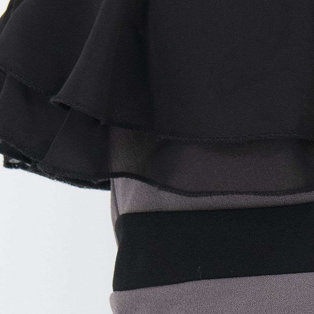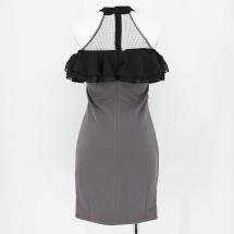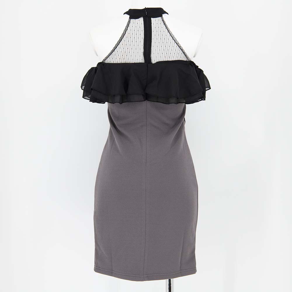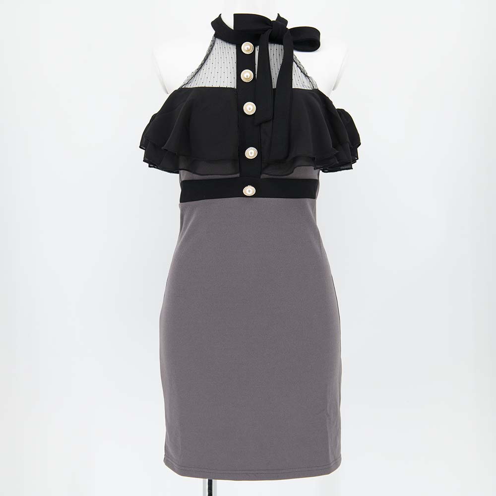 ドットシアー肩あき胸元フリルアメリカンスリーブタイトミニドレス